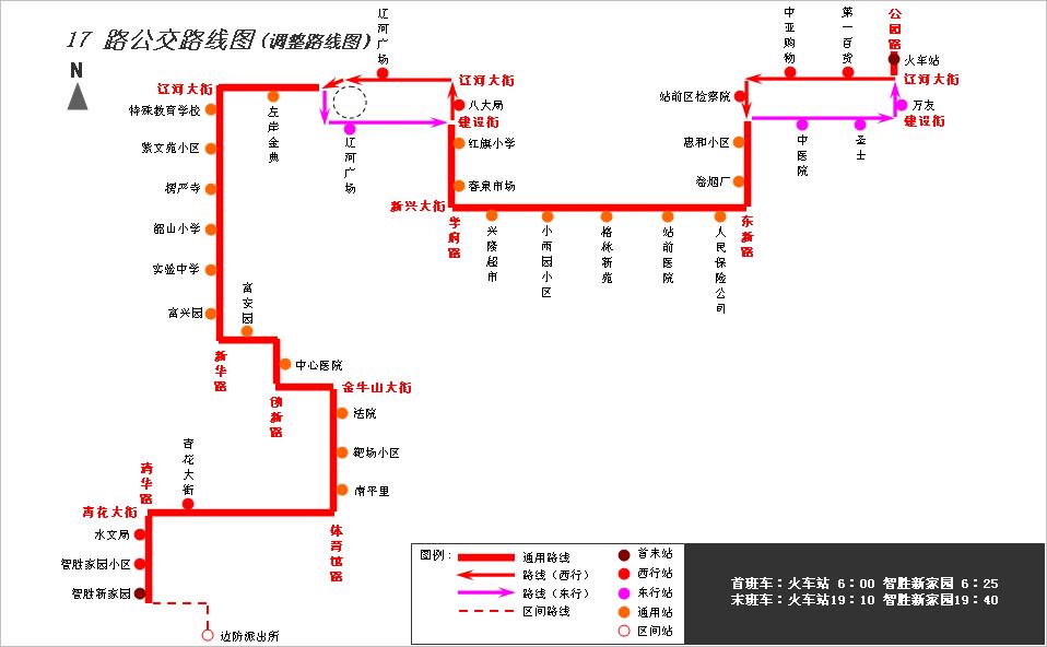 停用17路東風路沿線“公汽公司”、“大潤發(fā)超市”及“人民保險公司”站位;新華路沿線“紫竹院小區(qū)”雙向站位,“鑫牛市場”西行站位;小循環(huán)路段“市委黨?!?、“信訪局”西行站位,“鑫牛市場”、“靶場小區(qū)”東行站位;